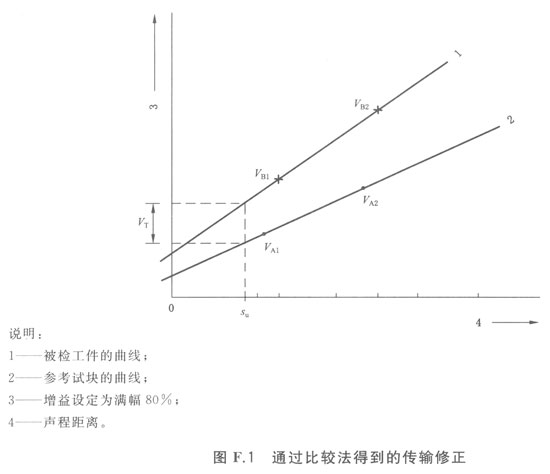 將探頭置于參考試塊上,分別將第一次和第二次底波調(diào)整至示波屏的同一高度,并記下相應(yīng)的增益值(VA1,VA2見圖F.1)。依據(jù)增益值與聲程距離的關(guān)系繪制出圖G.1中的線2。然后將探頭重新置于工件上,重復上述步驟得到(VB1,VB2和圖F.1中的線1)。對應(yīng)適當?shù)穆暢?span style=";padding: 0px">(su),通過兩線得出增益差值,即傳輸修正(DVt),見圖F.1。