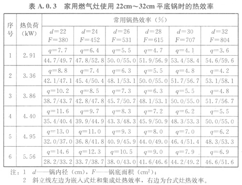 A03家用燃?xì)庠钍褂?/span>22cm32cm平底鍋時(shí)的熱效率可采用表A03的數(shù)值。