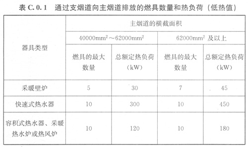 C01主、支并列型共用煙道系統(tǒng)(C01),主煙道橫截面積、燃具的最大數(shù)量和總額定熱負(fù)荷應(yīng)符合表C01的規(guī)定。