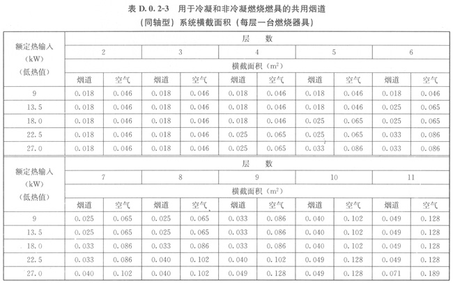 3當(dāng)每層設(shè)置1臺(tái)燃具時(shí),同軸型煙道尺寸應(yīng)按表D02-3的規(guī)定采用。