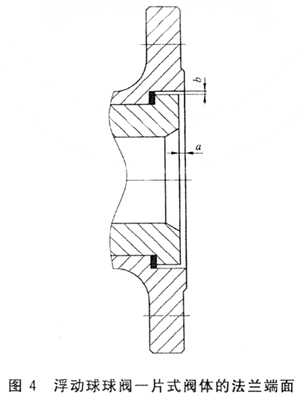 5.3.1.2 一片式法蘭球閥(如圖1所示)非完整密封面的要求:內(nèi)裝閥座從閥體一側(cè)法蘭端的流道裝入并固定在閥體內(nèi),該閥座與閥體的間隙見圖4,尺寸a應該不超過0.25mm,尺寸b應不超過1.5mm。