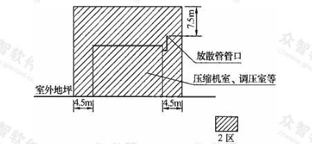 工藝裝置區(qū)邊緣外4.5m內(nèi),放散管管口(或最高的裝置)以上7.5m內(nèi)范圍為2區(qū)。