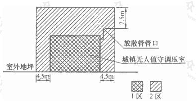 調(diào)壓室內(nèi)部的空間為1區(qū)。調(diào)壓室建筑物外壁4.5m內(nèi),屋頂(以放散管管口計(jì))以上7.5m內(nèi)的范圍為2區(qū)。