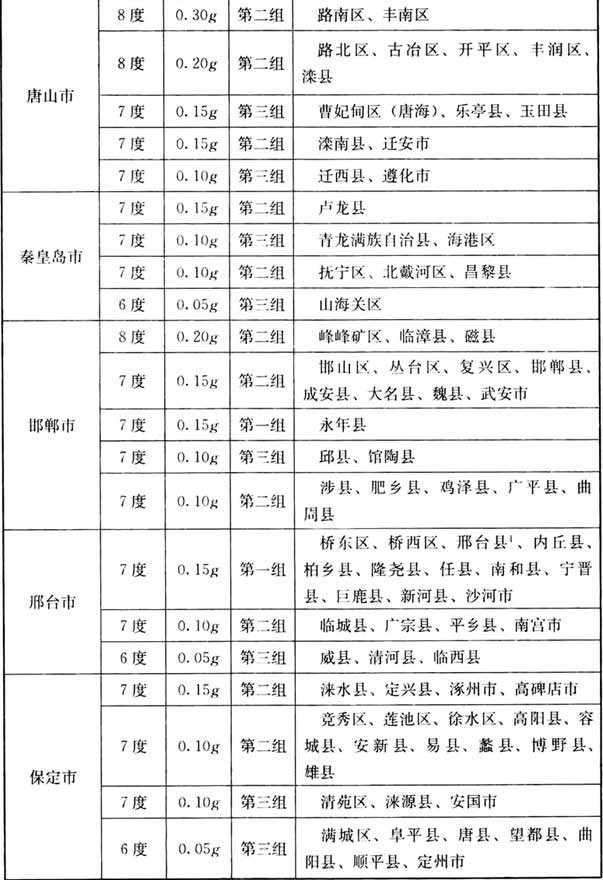 本附錄僅提供我國(guó)各縣級(jí)及縣級(jí)以上城鎮(zhèn)地區(qū)建筑工程抗震設(shè)計(jì)時(shí)所采用的抗震設(shè)防烈度(以下簡(jiǎn)稱“烈度”)、設(shè)計(jì)基本地震加速度值(以下簡(jiǎn)稱“加速度”)和所屬的設(shè)計(jì)地震分組(以下簡(jiǎn)稱(“分組”)。本表摘自《建筑抗震設(shè)計(jì)規(guī)范》 GB50011-2010(2016年版)附錄A