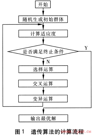 遺傳算法作為一種全局優(yōu)化搜索方法,以其簡(jiǎn)單通用、魯棒性強(qiáng)、適于并行處理以及應(yīng)用范圍廣等特點(diǎn),在求解復(fù)雜的工程優(yōu)化問題中取得了良好的效果。它是基于生物進(jìn)化的思想,將優(yōu)化計(jì)算中的迭代過程模擬成物種進(jìn)化的過程,形成一種具有“生成+檢驗(yàn)”特征的搜索算法[5]。它以編碼空間代替問題的參數(shù)空間,以適應(yīng)度函數(shù)為評(píng)價(jià)依據(jù),以編碼群體為進(jìn)化基礎(chǔ),以對(duì)群體中個(gè)體位串的遺傳操作實(shí)現(xiàn)選擇和遺傳機(jī)制,建立起一個(gè)迭代過程,使遺傳算法具有了其他傳統(tǒng)優(yōu)化方法所沒有的特性。遺傳算法的計(jì)算流程見圖1。