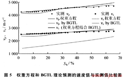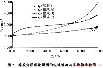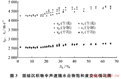 在固結(jié)沉積物實驗中,筆者發(fā)現(xiàn)低飽和度的水合物(飽和度小于10%)對聲速影響不明顯的現(xiàn)象,這種現(xiàn)象也被不同學(xué)者所捕捉[19~20]。經(jīng)上述分析后認為,水合物在沉積物孔隙流體中形成,對聲速影響不大,可能是造成這一現(xiàn)象的原因。而當水合物膠結(jié)沉積物顆粒時,其對聲速的影響則可能成倍增長,如在松散沉積物中,微量的水合物(飽和度1%左右)即可使縱波速度增長200~300m/s。可見,在天然氣水合物的資源評價中,了解水合物的微觀分布同樣具有重要的作用。