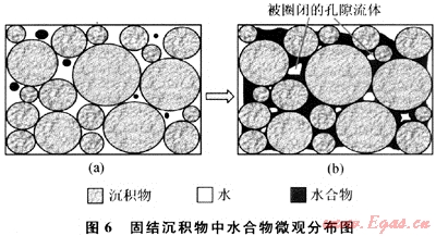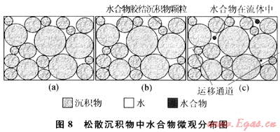 水合物的微觀分布對沉積物內(nèi)氣體運移通道具有重要影響:在固結(jié)沉積物中,水合物在飽和度大于30%后膠結(jié)沉積物顆粒,使沉積孔隙中部分流體被“封閉”,得不到氣源的供給而不能進一步生成水合物;而在松散沉積物中,大部分水合物因在孔隙流體中生成(只有最初1%飽和度的水合物膠結(jié)沉積物顆粒),未堵塞流體運移通道,因此水合物幾乎能完全充填孔隙。