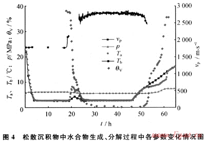 松散沉積物為采自于青島海邊的天然砂,粒徑為0.18~0.25mm,其物質(zhì)成分及含量如表2所示。由于難以探測松散沉積物的橫波速度,本文實驗僅獲取了縱波速度隨水合物生成和分解的變化情況(圖4)。結(jié)果表明,水合物剛開始生成時,縱波速度有一個陡然增大的現(xiàn)象,隨后由于超聲衰減極大,縱波速度難以獲取[13]。水合物完成生成時,含水合物松散沉積物的縱波速度為278m/s左右,比含飽和水沉積物的聲速增長1000m/s左右。
