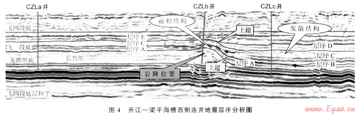 圖3是開江-梁平海槽西側(cè)分別位于臺地、生物巖隆和海槽的3口井的連井圖,利用測井資料與地震資料將飛一段至飛三段劃分出4套地震層序,合成地震記錄中黃色區(qū)域為儲層段。層序A為高位早期,水體較深,儲層基本不發(fā)育。層序B-C為高位晚期,儲層開始發(fā)育,CZLb井位于臺緣帶上,儲層段聲波曲線明顯降低,其儲層厚度較大,合成記錄上儲層底部地震反射明顯增強(qiáng);開闊臺地內(nèi)CZLa井在層序B-C內(nèi)雖有一定的儲層發(fā)育,但厚度明顯變薄,合成記錄上儲層底部反射異常與臺緣帶反射相比異常現(xiàn)象降低;位于深水海槽內(nèi)CZLc井在層序B-C內(nèi)無儲層發(fā)育。