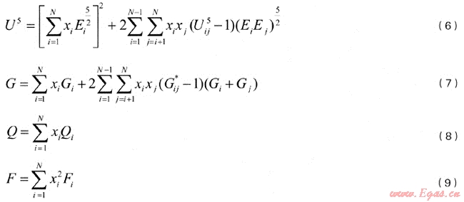 式(5)中的U,G,Q,F(xiàn)只與天然氣的組成有關(guān),按式(6)~(9)計(jì)算: