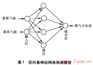徑向基神經(jīng)網(wǎng)絡(luò)[2]是一種兩層前向型神經(jīng)網(wǎng)絡(luò),包含一個(gè)具有徑向基函數(shù)神經(jīng)元的隱層和一個(gè)具有線性神經(jīng)元的輸出層。在燃?xì)舛唐谪?fù)荷預(yù)測(cè)領(lǐng)域中,它以訓(xùn)練速度快、學(xué)習(xí)精度高的優(yōu)點(diǎn)開始逐漸嶄露頭角??紤]到燃?xì)馊肇?fù)荷受天氣狀況影響比較大,筆者以網(wǎng)絡(luò)的輸入為最低氣溫、最高氣溫,輸出為燃?xì)馊肇?fù)荷建立徑向基神經(jīng)網(wǎng)絡(luò)預(yù)測(cè)模型(見圖1)。