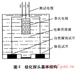 極化探頭由測試試片(自然腐蝕試片和極化試片)、參比電極和電解質(zhì)組成,其基本結(jié)構(gòu)見圖4。極化試片用和管道相同的材質(zhì)制成,并用導(dǎo)線與管道相連,外部用絕緣體隔離,只留一個(gè)多孔塞子(滲透膜)作為測量通路,這樣的結(jié)構(gòu)可使參比電極和燃?xì)夤艿乐g的電阻壓降最小,直接測量無IR降電位,而不必?cái)嚅_管道保護(hù)電流或間歇中斷與管道連接的電纜。只有將電位測試探頭處于與管道相同的土壤中,電位測試探頭才有效。