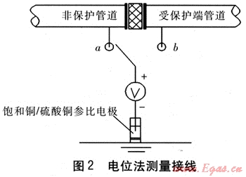 在絕緣接頭性能良好的情況下,點(diǎn)b處電位Vb在數(shù)值上和管道陰極保護(hù)電位相近(-850~-1200mV),點(diǎn)a處電位Va在數(shù)值上與管道自然電位相近。根據(jù)測量結(jié)果,若Vb明顯地比Va更小(電位差的絕對值為200~500mV),則認(rèn)為絕緣接頭的絕緣性能良好。如果電位差的絕對值小于200mV,則應(yīng)該使用其他檢測方法進(jìn)一步測量怕-,以確定絕緣接頭是否失效。