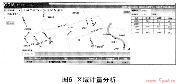 在GIS地理圖層上標(biāo)定區(qū)域流量計,通過GDIA系統(tǒng)將兩數(shù)據(jù)源的數(shù)據(jù)進行整合,將《SCACA系統(tǒng)》流量計測點數(shù)與《客戶信息管理系統(tǒng)》中該區(qū)域用戶賬本信息配對綁定,清晰的反映抄表月份區(qū)域內(nèi)購入與實際銷售量的差異,高效地獲取區(qū)域產(chǎn)銷差的準確數(shù)據(jù),擺脫以往手工摘錄事后拼揍的統(tǒng)計方式,為職能部門與管理者提供區(qū)域產(chǎn)銷差分析基礎(chǔ)數(shù)據(jù)(見圖6)。