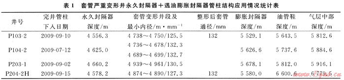 普光氣田套管變形井發(fā)生后,通過普光氣田主體嚴(yán)重套管變形井綜合修井技術(shù)研究,采用井下震擊整形技術(shù)、滾壓整形技術(shù)實現(xiàn)套管擴徑,普光103-2、204-2H井整形后通徑達(dá)到132~134mm,保證小直徑遇油膨脹封隔器下井的要求;2009年7~9月份應(yīng)用外徑130mm遇油膨脹封隔器,采用“永久封隔器+遇油膨脹封隔器”采氣管柱結(jié)構(gòu),先后完成了普光103-2、104-2、203-1定向井、204-2H水平井投產(chǎn)作業(yè)施工,現(xiàn)場應(yīng)用效果較好(見表1),對高含硫嚴(yán)重套管變形井修井投產(chǎn)具有重要現(xiàn)實意義。