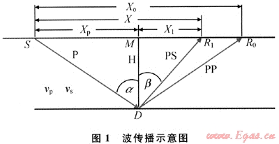 波場(chǎng)的反射與轉(zhuǎn)換是同時(shí)發(fā)生的,于共反射點(diǎn)處有一組不同偏移距縱波產(chǎn)生時(shí)相應(yīng)有一組共轉(zhuǎn)換橫波與之相伴而生??v波和轉(zhuǎn)換橫波同時(shí)向上傳播,到達(dá)地面后被儀器記錄下來。圖1為波的傳播路徑示意圖[2~5,8],界面深度為h,S為震源,由震源產(chǎn)生的下行P波遇到界面后,產(chǎn)生反射P波(P-P波)的同時(shí),又轉(zhuǎn)換形成反射SV波(P-SV波),然后上行傳播到地面(圖1)。其中,R0是P-P波地面接收點(diǎn),R1是P-SV波地面接收點(diǎn),D是界面反射點(diǎn)位置,M是地面共中心點(diǎn)位置。