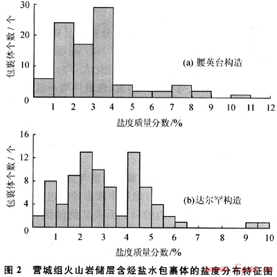 營城組儲層中烴類包裹體以氣態(tài)包裹體為主,分布有少量液態(tài)包裹體,二者均以沿切穿石英礦物中的微裂隙成帶狀分布為主,為同期形成的。含烴鹽水包裹體的鹽度代表了當時流體的鹽度性質(zhì),其鹽度的差別可以反映包裹形成期次的差別,腰英臺構(gòu)造帶與達爾罕構(gòu)造帶營城組含烴鹽水包裹體鹽度存在一定的差別。根據(jù)其鹽度分布特征,腰英臺營城組含烴鹽水包裹體鹽度質(zhì)量分數(shù)介于1.0%~4.0%,為一期形成(圖2-a);達爾罕構(gòu)造帶營城組含烴鹽水包裹體存在兩期(圖2-b),第一期含烴鹽水包裹體的鹽度質(zhì)量分數(shù)介于2.0%~3.5%,第二期為4%~5%,第一期包裹體的鹽度與腰英臺構(gòu)造帶的較為接近,與烴類包裹體伴生的第二期鹽水包裹體在腰英臺構(gòu)造帶不發(fā)育。