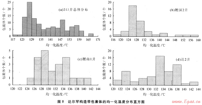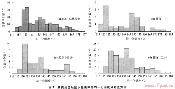 不同期次的包裹體均一化溫度分布頻率存在明顯的差別。因此,包裹體的均一化溫度可以作為判斷流體包裹體形成期次的有效參數(shù)[4~5]。根據(jù)腰英臺構(gòu)造帶腰深1、腰深101、腰深102井營城組火山巖儲層中與烴類包裹體伴生的鹽水包裹體均一化溫度的分布特征分析表明(圖3),液態(tài)烴類與氣態(tài)烴類包裹體為同期形成產(chǎn)物,均一化溫度分布范圍為120~153℃,存在2個峰值,前峰值為液態(tài)烴類的充注高峰,均一化溫度分布介于120~129℃;后峰值為氣態(tài)烴類的充注高峰,均一化溫度分布介于132~141℃,氣態(tài)烴類充注高峰位于液態(tài)烴類充注高峰之后,但油氣基本上呈連續(xù)充注成藏。