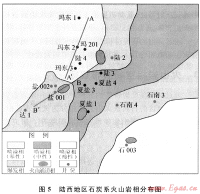 本區(qū)石炭系火山巖巖相分布基本確定,大致呈北東-南西向的條帶狀分布,西北部地區(qū)絕大部分是噴溢相的基性火山巖,向東南依次過(guò)渡為爆發(fā)相火山巖、噴溢相的中性火山巖;向北西方向再次出現(xiàn)了爆發(fā)相火山巖,該地區(qū)東南角是噴溢相的中酸性火山巖。從地震剖面上識(shí)別出本區(qū)有4個(gè)比較明顯的古火山口。在石炭紀(jì)時(shí)期,本區(qū)經(jīng)歷了大范圍的火山爆發(fā),噴發(fā)出的大量巖漿沿地勢(shì)向四周擴(kuò)散,巖漿由西北角的基性逐漸向南東過(guò)渡為中酸性。儲(chǔ)集條件也是由西北向東南逐漸變好,所以位于陸西地區(qū)東南部的石西凸起應(yīng)作為下一步勘探的重點(diǎn)區(qū)域。