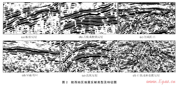 不同的地震相對(duì)應(yīng)一定的火山巖巖相,詳細(xì)劃分地震相有利于進(jìn)一步分析該地區(qū)火山巖巖相的分布。通過(guò)研究劃分出陸西地區(qū)石炭系火山巖地震反射特征主要有以下幾種:舌狀或楔狀反射、板狀反射、弧狀反射、丘狀或蘑菇狀等反射特征(圖2)。