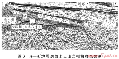 弧狀反射主要反映噴溢而出的熔巖流層,大多沿地形傾覆趨勢(shì)由高向低發(fā)展,反射同相軸呈弧形,由2到3個(gè)相位組成,表現(xiàn)為連續(xù)的強(qiáng)振幅和強(qiáng)反射,弧形下伏部位常由于屏蔽而表現(xiàn)為較弱的反射特征,一般比較雜亂或空白無(wú)反射(圖2-e),這主要是由偏基性的玄武質(zhì)巖漿形成的。玄武質(zhì)巖漿黏度較小,易于流動(dòng),噴發(fā)到地表后,往往朝著地形低洼處流動(dòng),因而玄武巖分布受古低洼地形控制較明顯。