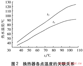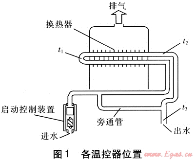 一般溫控器的設(shè)置位置從水路系統(tǒng)上考慮總是在換熱器換熱管的中端、換熱器換熱管末端、熱水器出水處(見圖1)。該3處溫度(以下簡稱中端t1、末端t2和出水t3)之間存在著關(guān)聯(lián)性。