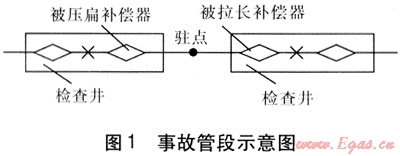 在直埋管道管系中,為減少固定支座的數(shù)量,往往布置成“駐點(diǎn)”形式。直埋管道兩個(gè)規(guī)格型號相同的相鄰補(bǔ)償器之間管道中點(diǎn)不設(shè)固定點(diǎn),當(dāng)管道受熱均勻膨脹時(shí),在兩個(gè)補(bǔ)償器中間必然形成一個(gè)力的相對平衡點(diǎn),即駐點(diǎn)。理論上以該點(diǎn)為界,管道向左右兩個(gè)方向均勻膨脹,一般認(rèn)為,力的平衡點(diǎn)會因管道受力不均勻而發(fā)生少許偏移,一般按20%余量進(jìn)行考慮。筆者認(rèn)為,這種布置方式值得商榷。武威市城南集中供熱有限責(zé)任公司有一段直埋管道(Ø630×10)采用這種布置方式,固定支座之間距離為206m,兩只補(bǔ)償器規(guī)格型號完全相同,補(bǔ)償量均為150mm。在2008年熱網(wǎng)運(yùn)行中,其同側(cè)兩個(gè)補(bǔ)償器相繼發(fā)生故障,拆解后發(fā)現(xiàn),一個(gè)補(bǔ)償器已被壓扁,壓縮量200mm,另一個(gè)不僅未起到補(bǔ)償壓縮作用,反而被拉長50mm,一個(gè)補(bǔ)償器伸長對另一個(gè)補(bǔ)償器造成過度壓縮,從而使兩個(gè)補(bǔ)償器均發(fā)生破壞失效,事故管段示意圖見圖1。