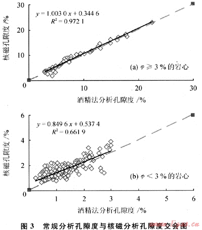 4口井的277塊巖樣的核磁實驗表明:對于較高孔隙度的樣品核磁可準確地計算孔隙度、滲透率,而孔隙度較低的樣品,核磁計算的孔、滲參數(shù)誤差很大(圖3)。