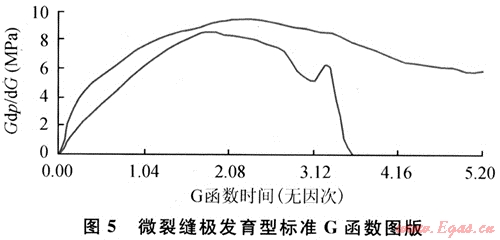 其特征主要表現(xiàn)為主裂縫閉合前G函數(shù)曲線凸起很高,一般數(shù)值在4以上(圖5)。該類儲(chǔ)層閉合前由于受多條微裂縫濾失影響,造成裂縫濾失不恒定且濾失大。