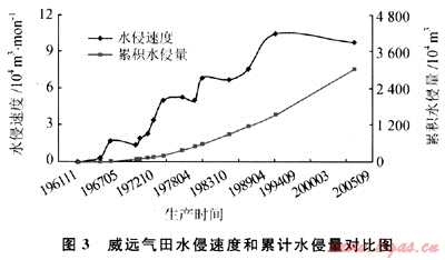 圖3是在滿足最優(yōu)擬合偏差函數(shù)最小時,在水侵動態(tài)分析和生產(chǎn)動態(tài)數(shù)據(jù)的基礎上得到的水侵速度和累積水侵量與生產(chǎn)時間的關系。水侵速度呈臺階式上升,這和開采階段密切相關。