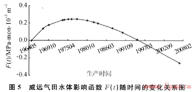 另一方面,從函數(shù)F(t)隨時間的變化關系曲線(圖5)可知,在威遠氣田開井投產(chǎn)初期,由于采氣速度高、底水沿裂縫竄進侵入氣藏、水體能量表現(xiàn)為逐漸增大;在進入生產(chǎn)中期時,水體的彈性能量開始逐漸減弱,水體的膨脹程度開始逐漸減小,進入生產(chǎn)末期后,使函數(shù)F(t)形成一種持續(xù)下降甚至為負值,表明隨著水體能量的大量釋放以及受威遠氣田大面積關井影響,部分地層水有可能出現(xiàn)沿大裂縫系統(tǒng)回退的現(xiàn)象,說明整個水體能量表現(xiàn)為具有可排性,如果在合適的位置打排水井大量排水,可使氣藏的采收率得到大幅度地提高。