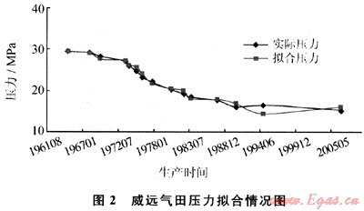 根據(jù)計算得到的儲量值,可得到威遠氣田最優(yōu)擬合數(shù)據(jù)及壓力擬合情況(圖2、表2)。