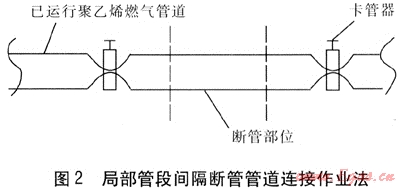 局部管段間隔斷管管道連接作業(yè)法見圖2。本作業(yè)適用于已運(yùn)行聚乙烯燃?xì)夤艿琅c新建燃?xì)釶E管道的連接。在聚乙烯管道需連接部位左右適當(dāng)位置分別采用卡管器將已運(yùn)行管道卡緊,選用隔爆手槍電鉆在需斷管部位打孔卸壓、斷管。將電熔套管安裝在斷管兩端口并與新建聚乙烯管進(jìn)行電熔焊接,待焊接完成后松開卡管器,管道連接作業(yè)完成。此作業(yè)方法優(yōu)點(diǎn)主要是操作方便,但存在的問題主要有: