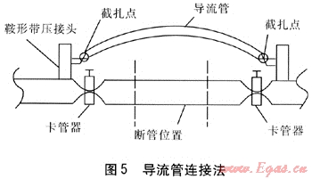 在采用局部管段間隔斷管管道連接作業(yè)前,在卡管器前、后分別焊接鞍形帶壓接頭,在帶壓不停氣的條件下使導(dǎo)流管正常運(yùn)行。導(dǎo)流管流通面積及前后鞍型帶壓接頭數(shù)量根據(jù)下游用戶實(shí)際用氣量確定,連接方式同并聯(lián)鞍形帶氣接頭作業(yè)法。待導(dǎo)流管運(yùn)行正常后,按局部管段間隔斷管管道連接作業(yè)法實(shí)現(xiàn)新建聚乙烯管道與已運(yùn)行聚乙烯管道連接。管道連接完成后,采用卡管器在截扎點(diǎn)位置將導(dǎo)流管斷開并用對(duì)焊堵頭封嚴(yán),此作業(yè)法完成。我們于2007年8月在西青區(qū)楊柳青鎮(zhèn)明月華苑紅線外天然氣工程中實(shí)施此作業(yè)法,取得了良好的效果。