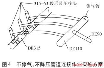 我們?cè)诮蚰祥_發(fā)區(qū)(東區(qū))建龍分子篩天然氣工程中進(jìn)行該方法的實(shí)施作業(yè)。該工程新建DE90燃?xì)夤艿琅c已運(yùn)行DE315燃?xì)夤艿肋B接,由于園區(qū)內(nèi)無法實(shí)施停氣降壓作業(yè),經(jīng)研究采用了鞍形帶壓接頭并聯(lián)方案。不停氣、不降壓管道連接作業(yè)實(shí)施方案見圖4。管道連接作業(yè)完成后,經(jīng)對(duì)用戶實(shí)際用氣設(shè)備燃?xì)饬髁?、壓力檢測(cè),完全符合設(shè)計(jì)要求。此管道連接作業(yè)方法現(xiàn)已在我公司推廣使用,大大減少了氣量損失,加快了管道連接作業(yè)進(jìn)度。但也存在不足之處,如DN 150mm以上管道若實(shí)施此方案,所需鞍形帶壓接頭數(shù)量過多,與集氣管連接受環(huán)境限制較大,因此在大管徑應(yīng)用上具有局限性。