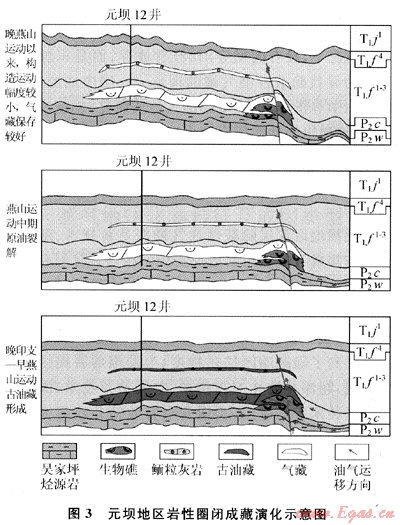 元壩地區(qū)巖性圈閉形成早,油氣配置關(guān)系良好。研究表明圈閉的成藏演化主要經(jīng)歷古油藏形成、原油裂解成氣藏及后期構(gòu)造抬升3個(gè)階段(圖3)。