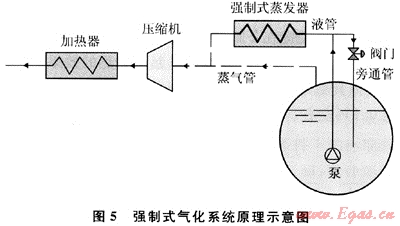 為了提高LNG船的氣化效率,在一個(gè)富有彈性的范圍內(nèi)提供更多的天然氣,可以在LNG船上考慮設(shè)計(jì)強(qiáng)制氣化系統(tǒng)。強(qiáng)制氣化系統(tǒng)主要包括加熱器、壓縮機(jī)、強(qiáng)制式蒸發(fā)器、閥門(mén)、水泵(液貨艙內(nèi))以及一些附屬設(shè)備等。相關(guān)原理如圖5所示。