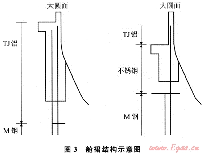 在MOSS型船的球形儲(chǔ)槽中,沿艙裙結(jié)構(gòu)的漏熱量占儲(chǔ)槽總漏熱量的比例較大,如果我們?cè)诖肆鞒讨胁捎幂^為先進(jìn)的熱阻滯結(jié)構(gòu),則可大大地減少漏熱量。此項(xiàng)技術(shù)的關(guān)鍵在于插嵌入一塊特殊材質(zhì)的不銹鋼板在鋁和鋼質(zhì)裙之間,這樣既可以起到隔熱的效果,又可以發(fā)揮其穩(wěn)定系統(tǒng)的作用,而且可以將日氣化率下降到0.1%左右。其結(jié)果如圖3所示。
