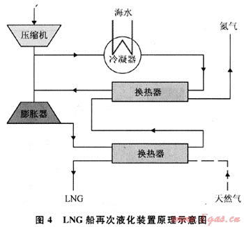 在LNG船上裝備可靠性較強(qiáng)的再次液化裝置,具有巨大的市場(chǎng)價(jià)值。再次液化裝置分為全部再次液化裝置、自持式再次液化裝置和部分再次液化裝置3類,其均處于可行性研究階段,并未實(shí)際投入生產(chǎn)使用。圖4為L(zhǎng)NG船的再次液化裝置原理圖。