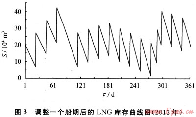 2) 應用動態(tài)數(shù)學模型,通過LNG庫存曲線(圖3)可知所需罐容為41.87×104m,若選用常規(guī)l6×104m的儲罐,應配置2.62個儲罐,取整為3個儲罐;若選用18×104m的儲罐,則應配置2.33個,取整為3個儲罐。由此可見,采用靜態(tài)模型計算均勻來船情況下的LNG儲罐罐容尚且合理,而一旦來船期變化較大,靜態(tài)模型計算結(jié)果明顯不合理。而動態(tài)數(shù)學模型的計算結(jié)果更為合理。