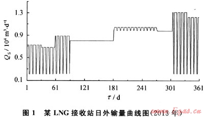 該LNG接收站項目LNG運輸船選擇21.5×104m3的主力船型,其2013年期的LNG接收站日外輸氣量(QS)曲線(同時也是匹配下游用氣市場的日用氣量曲線)如圖1所示。用戶類型包括管道外輸氣用戶(12.4%)、LNG槽車用戶(18.5%)及燃氣電廠用戶(69.1%)。