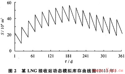 2) 應用動態(tài)數(shù)學模型進行計算的結(jié)果為:所需有效罐容為56.81×104m3,LNG庫存(S)曲線如圖2所示,若選用常規(guī)16×104m3的儲罐,應配置3.55個儲罐,取整為4個儲罐;若選用18×104m3的儲罐,則應配置3.16個,取整為4個儲罐。由此可見,該動態(tài)數(shù)學模型與原靜態(tài)估算模型的結(jié)論一致(原靜態(tài)模型的結(jié)果其實也是經(jīng)過設計單位內(nèi)部開發(fā)的動態(tài)仿真軟件校核過的)。