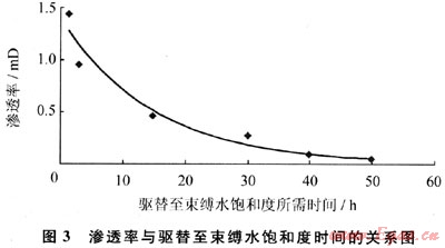 以氣驅(qū)水1h為例,驅(qū)替1h后,儲(chǔ)層滲透率越低,含水飽和度就越高,由此造成的暫時(shí)性水鎖損害越強(qiáng)(圖2),當(dāng)滲透率從1.5mD降到0.04mD時(shí),儲(chǔ)層滲透率損害率從17%增加到近90%。隨著驅(qū)替時(shí)間的增長(zhǎng),含水飽和度會(huì)逐漸降低,當(dāng)驅(qū)替至束縛水飽和度時(shí),暫時(shí)性水鎖完全解除。在驅(qū)替壓差及流體性質(zhì)一定的情況下,解除暫時(shí)性水鎖所需時(shí)間與儲(chǔ)層滲透率密切相關(guān),儲(chǔ)層滲透率越低,所用時(shí)間越長(zhǎng)(圖3);當(dāng)滲透率從1.5mD降到0.04mD時(shí),驅(qū)替至束縛水飽和度時(shí)所用時(shí)間從1.5增加到50h,表明儲(chǔ)層滲透率越低,暫時(shí)性水鎖越難解除。地層條件下所能提供的最大壓降要比實(shí)驗(yàn)室所用的壓差小得多,且實(shí)驗(yàn)室用的是干氮?dú)?,因此在地層條件下天然氣反排外來(lái)工作液至束縛水飽和度所需時(shí)間比實(shí)驗(yàn)室長(zhǎng)得多,其時(shí)間長(zhǎng)短與儲(chǔ)層滲透率有關(guān)。