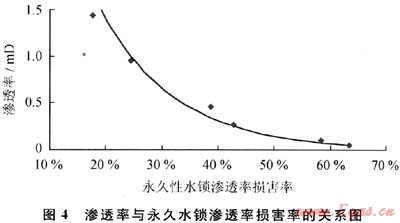 天然氣反排外來(lái)工作液降到束縛水飽和度后就再也不能降低了,由于儲(chǔ)層原始含水飽和度低于束縛水飽和度,這樣就有一部分水鎖永遠(yuǎn)不能解除。永久性水鎖滲透率損害率與儲(chǔ)層滲透率密切相關(guān),儲(chǔ)層滲透率越低,束縛水飽和度與原始含水飽和度差值越大(表1、圖1),永久性水鎖滲透率損害率也越強(qiáng)(圖4)。當(dāng)滲透率從1.5mD降到0.04mD時(shí),永久性水鎖滲透率損害率從17.75%增至63.33%。