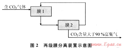 膜分離法是利用某些聚合材料制成的薄膜對(duì)不同氣體具有不同滲透率來選擇分離氣體的。膜分離的驅(qū)動(dòng)力是膜兩側(cè)的壓差,在壓差條件下,滲透率高的氣體組分優(yōu)先透過薄膜,形成滲透氣流,滲透率低的氣體則在薄膜進(jìn)氣側(cè)形成殘留氣流,兩股氣流分別引出從而達(dá)到分離的目的[21]。適用于CO2分離的膜材料為乙酸纖維、聚砜、聚酰胺等,由于膜本身或膜組件的其他材料耐熱性能差,150℃是其操作溫度的上限。近年來一些性能優(yōu)異的新型膜材質(zhì)正不斷涌現(xiàn),如聚酰亞胺膜、聚苯氧改性膜、二胺基聚砜復(fù)合膜、含二胺的聚碳酸酯復(fù)合膜、丙烯酸酯的低分子含浸膜等均表現(xiàn)出優(yōu)異的C02滲透性。最近也有一些硅石、沸石和碳素?zé)o機(jī)膜的研制,但均存在使用溫度高、成本高,長期運(yùn)行可靠性差等問題。圖2為兩級(jí)膜分離富集CO2流程圖。