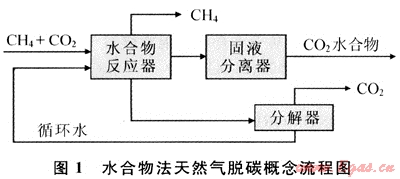 圖1為利用水合物分離技術(shù)進(jìn)行天然氣中捕集CO2的流程:將經(jīng)過預(yù)處理過酸性天然氣通入水合反應(yīng)器,在合適的操作條件下使混合氣中易生成水合物的CO2組分生成CO2水合物,被提濃的CH4自反應(yīng)器頂部引出。所生成的CO2水合物經(jīng)脫水后可直接利用[20],或隨水轉(zhuǎn)入水合物分解器中,分解后回注油氣藏以提高采收率。分解后的水或水與添加劑的混合物返回水合反應(yīng)器,循環(huán)利用。