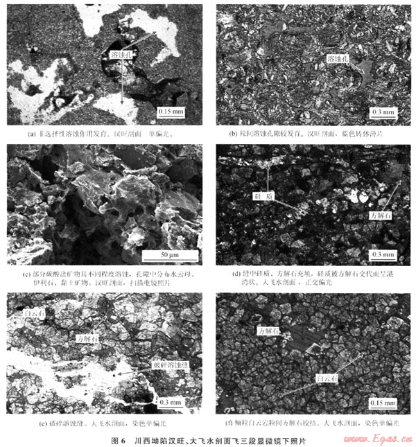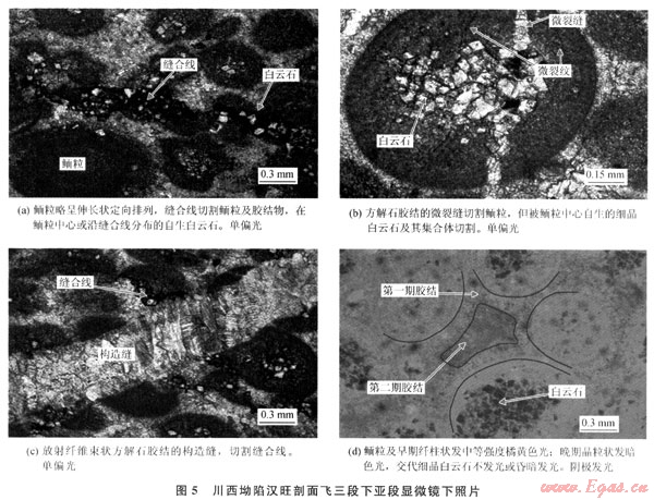 從成巖序列來看,川西坳陷北段南部與南段的成巖作用有明顯的差異,北段南部以海底成巖、淺埋成巖作用為主,而南段大飛水剖面以埋藏成巖作用為主,中、深埋藏成巖作用顯著??傮w上,飛三段成巖作用在平面上由北向南,成巖作用由海底向埋藏成巖變化。北段南部(如漢旺剖面下亞段)經(jīng)歷了明顯的海底成巖作用,纖維狀等厚環(huán)邊、粒狀方解石膠結(jié)普遍發(fā)育,這使原始粒間孔隙顯著減小。在埋藏成巖環(huán)境中,壓實(shí)、壓溶和膠結(jié)作用使孔隙度進(jìn)一步降低,而鮞粒內(nèi)及沿縫合線分布的白云巖化作用,對孔隙度影響較小,使最終孔隙度很低。漢旺剖面上亞段和南段(大飛水剖面)的成巖作用相似,埋藏期的壓實(shí)作用較強(qiáng)烈,白云巖化可能均為埋藏成因,重結(jié)晶現(xiàn)象較強(qiáng)烈且未發(fā)現(xiàn)同生成巖期大氣水溶蝕作用形成的鮞粒鑄模孔,表明可能與埋藏溶蝕作用有關(guān),中-晚期溶蝕作用是孔隙發(fā)育的重要因素。