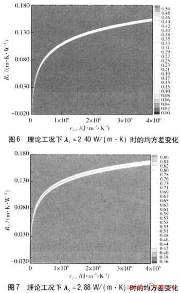 運(yùn)用參數(shù)估計法,給λs賦值:1.92、2.40、2.88W/(m·K),在參數(shù)估計中,分別對cp,s、Rb在一定的取值范圍內(nèi)連續(xù)賦值。通過計算機(jī)編程計算得到模擬工況下的均方差變化情況見圖12~14,圖右側(cè)色標(biāo)為均方差。由圖12~14可知,模擬工況下的結(jié)果不理想,均方誤差較小的淺色云圖中深色區(qū)域?qū)?yīng)多組cp,s、Rb,這樣就很難確定哪組數(shù)值是最優(yōu)值,即在參數(shù)估計中對其他參數(shù)的影響比較大。
