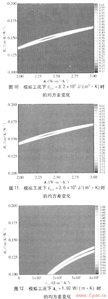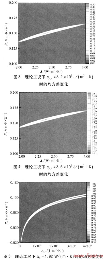 由圖2~4、9~11可知,均方差最小值的區(qū)域基本固定,其對應(yīng)的λs在2.4W/(m·K)左右。因此,可以得出結(jié)論,在實(shí)際過程中即使存在一些不確定因素的影響,得到的模擬值與理論值存在一定的偏差,但是經(jīng)過參數(shù)估計處理得到cp,s的變化對結(jié)果的影響也很小,cp,s偏差±12.5%對λs的影響在±2%左右。通常情況下cp,s的獲得可以依據(jù)現(xiàn)場鉆孔中心巖土分析來確定,相對誤差一般在±5%以內(nèi),對λs的影響更小。