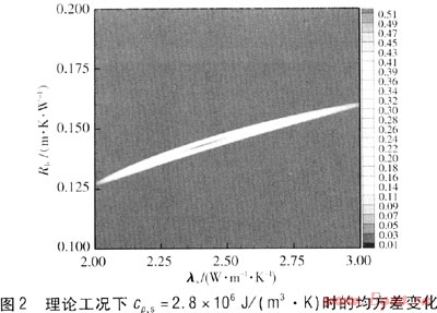 為了減少計算量,本文控制待求熱物性參數(shù)在一定范圍內(nèi)變化,得到相應(yīng)均方差,并采用Tecplot繪圖,在圖中即可得到均方差最小區(qū)域所對應(yīng)的待求參數(shù)值。